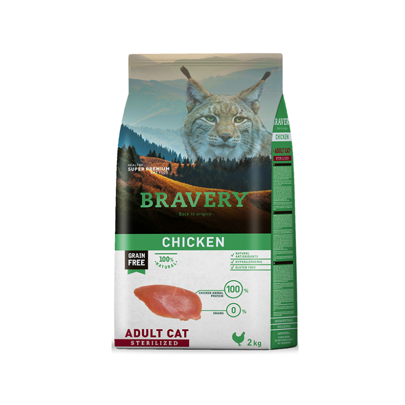 - Bravery Pollo Gato Adulto Esterilizado 2kg cuenta con un elevado contenido de proteínas