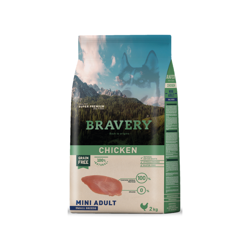 - Libre de Gluten: Bravery Pollo Mini Adulto es elaborado sin cereales, ideal para perros alérgicos o con problemas digestivos.