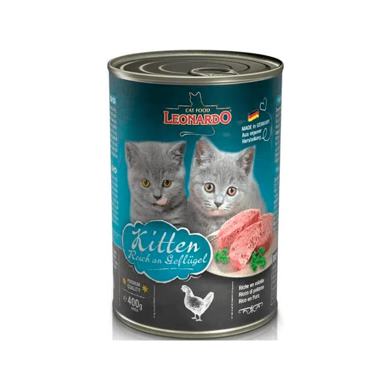 Los gatos, al igual que los felinos que viven en el medio natural, son carnívoros. Por eso solo utilizamos productos cárnicos frescos. Las latas LEONARDO Quality Selection Kitten están hechas a base de carne de ave y huevos de gallina para nutrir el crecimiento de gatitos de hasta 12 meses de edad.
