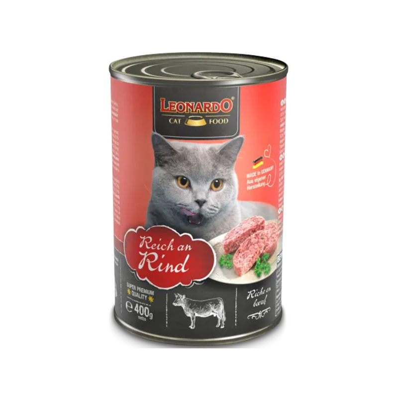 Los gatos, al igual que los felinos que viven en el medio natural, son carnívoros. Por eso solo utilizamos productos cárnicos frescos. Las latas LEONARDO Quality Selection Reich an Rind están hechas a base de carne fresca de ave y res, y corresponden a una dieta completa y balanceada para gatos adultos.