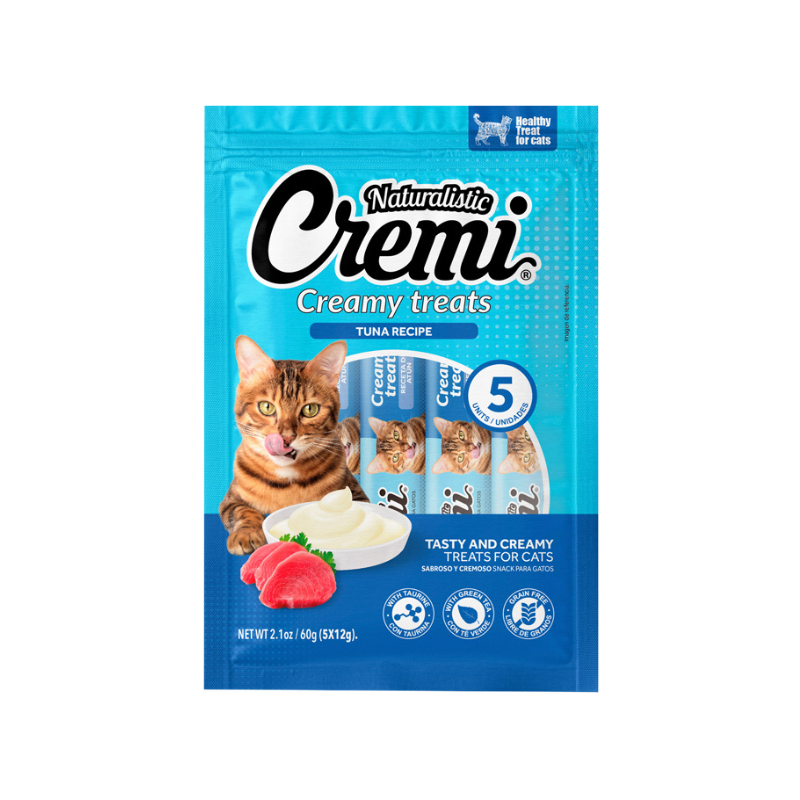 Naturalistic Cremi Atun 60gr, es un snack cremoso para gatos de todas Las edades. Elaborado con carne de salmón y atún, y reforzado con taurina, aminoácido esencial para los gatos. La fórmula además contiene extracto de té verde que tiene un alto poder antioxidante.