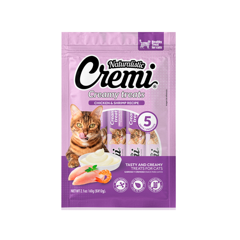 Naturalistic Cremi Pollo & Camarón 60gr es un snack cremoso para gatos de todas Las edades. Elaborado con carne de pollo y camarón, y reforzado con taurina, aminoácido esencial para los gatos. La fórmula además contiene extracto de té verde que tiene un alto poder antioxidante.