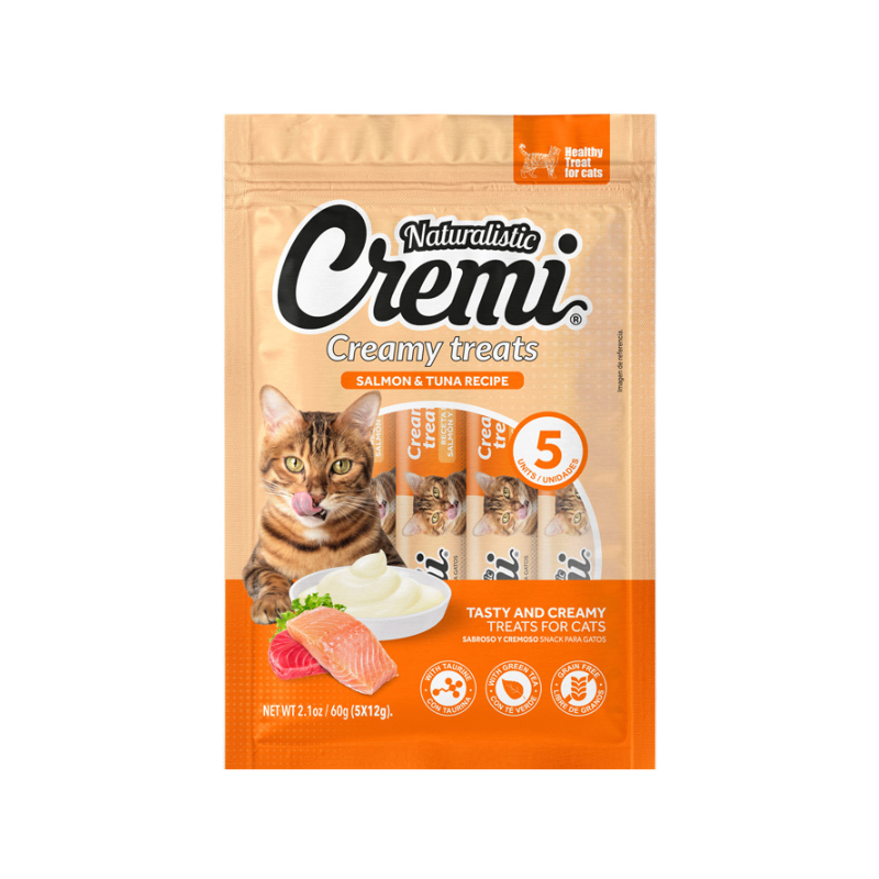 Naturalistic Cremi Salmon & Atun 60gr, es un snack cremoso para gatos de todas Las edades. Elaborado con carne de salmón y atún, y reforzado con taurina, aminoácido esencial para los gatos. La fórmula además contiene extracto de té verde que tiene un alto poder antioxidante.